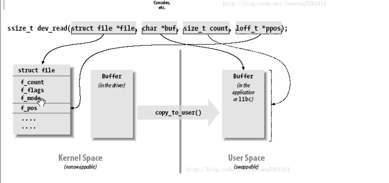 //用来从设备读取数据,该函数指针被赋为NULL时,将导致read系统调用出错并返回-EINVAL,