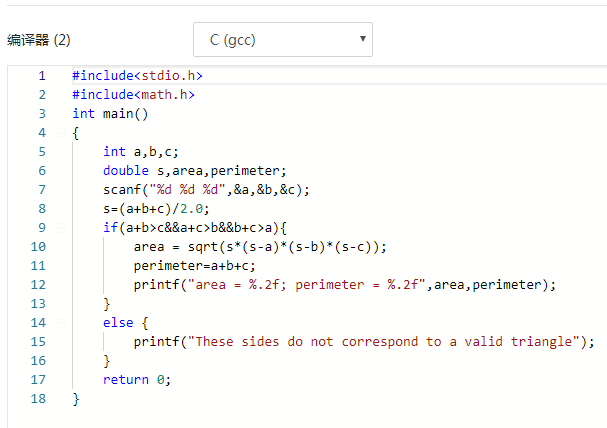 题目内容描述:本题要求编写程序,根据输入的三角形的三条边a、b、c,计算并输出面积和周长。注意:在一个三角形中, 任意两边之和大于第三边