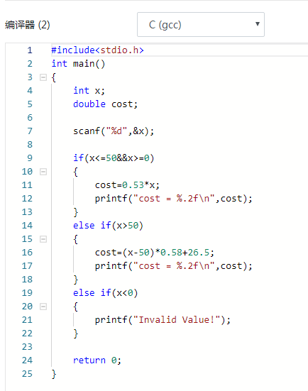 题目内容描述:为了提倡居民节约用电,某省电力公司执行“阶梯电价”,安装一户一表的居民用户电价分为两个“阶梯”:月用电量50千瓦时(含50千瓦时)以内的,电价为0.53元/千瓦时;超过50千瓦时的,超出部分的用电量,电价上调0.05元/千瓦时。请编写程序计算电费。