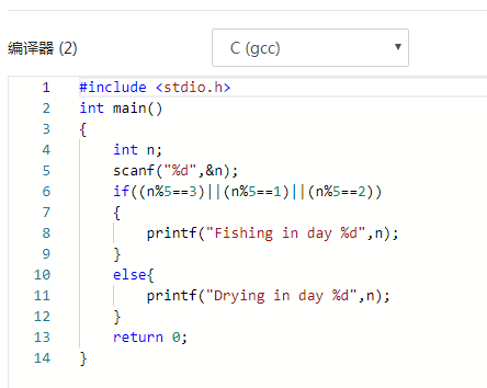 题目内容描述:中国有句俗语叫“三天打鱼两天晒网”。假设某人从某天起,开始“三天打鱼两天晒网”,问这个人在以后的第N天中是“打鱼”还是“晒网”?