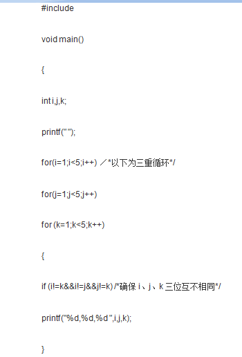 该代码功能:有1、2、3、4个数字,能组成多少个互不相同且无重复数字的三位数。