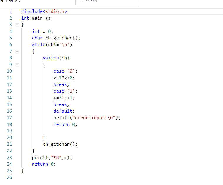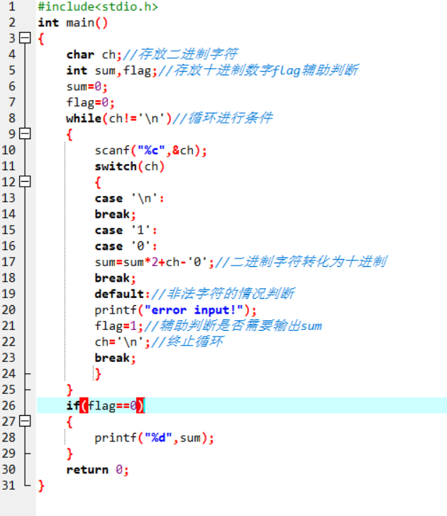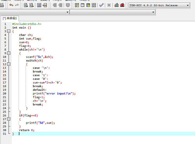 - 使用了switch语句,switch(ch)当输入新二进制字符十进制数*2+字符实现二进制转十进制。