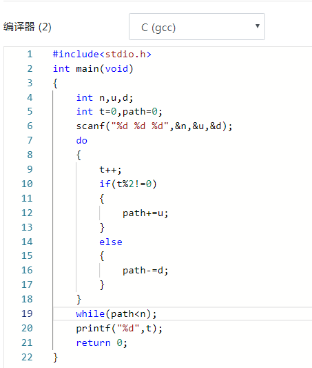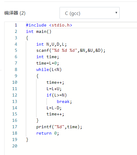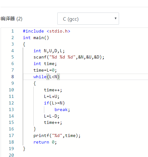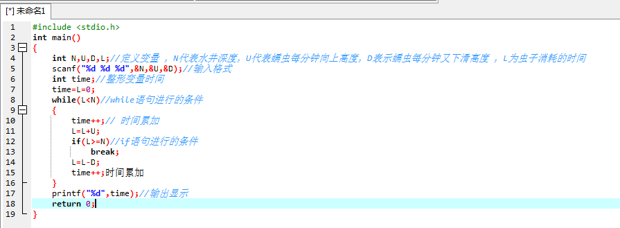 - 数据处理:用了while语句进行循环,if语句进行条件判定。用了表达式 L=L+U表示蠕虫爬的高度。用了表达式 L>=N,break;L=L-D;time++;表示蠕虫爬出的时间。