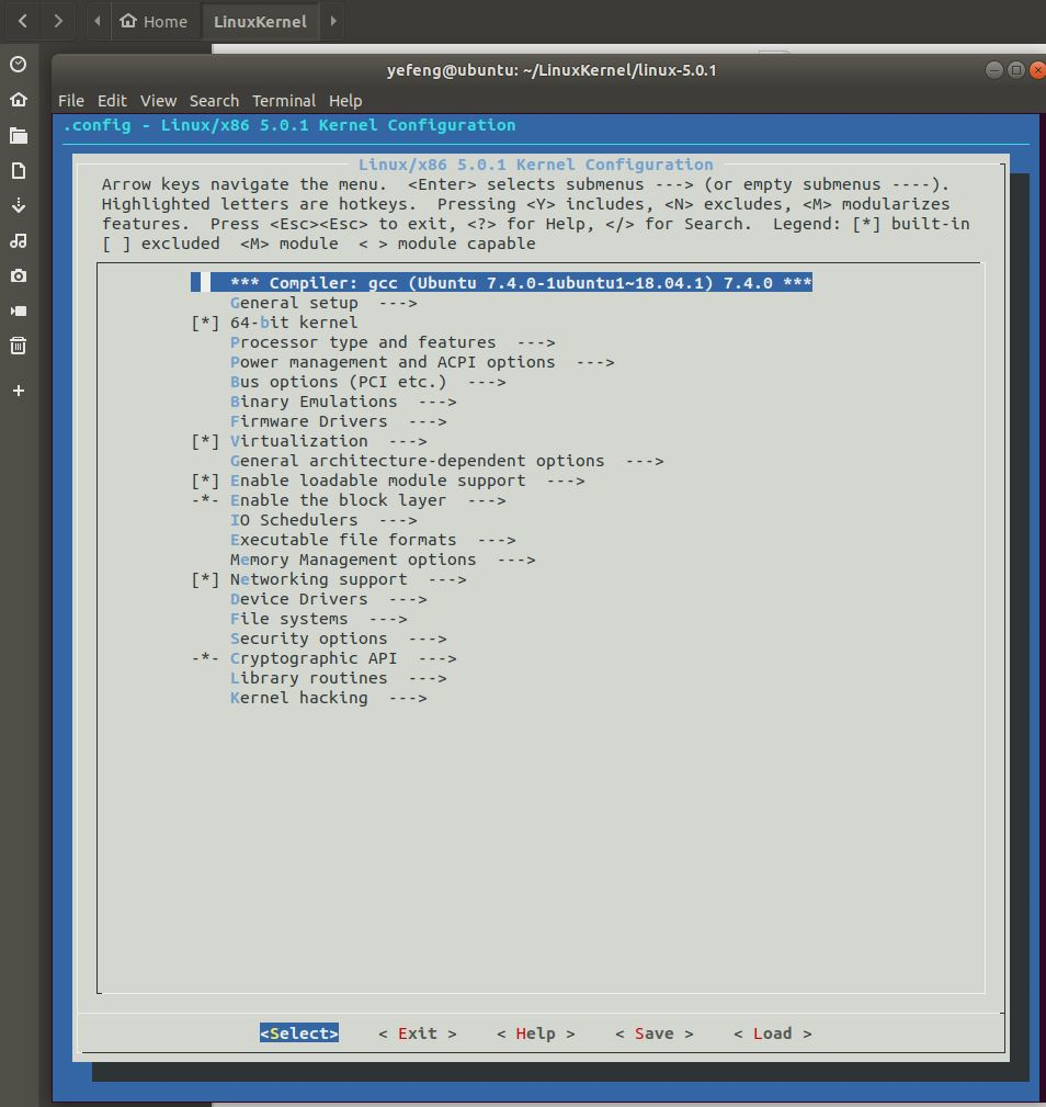 #进入解压出来的目录 cd /linux-5.0.1/ #使用现存内核的配置文件:(xxx处使用TAB补全) sudo cp /boot/config-xxx -r .config #应用现存配置文件 sudo make oldconfig #仅安装已有module sudo make localmodconfig #配置其他编译选项 sudo make menuconfig