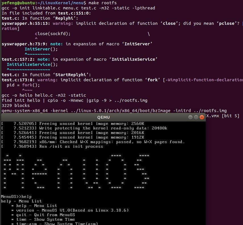 cd ~/LinuxKernel/ sudo apt install qemu#安装qemu命令 qemu-system-x86_64 -kernel linux-5.0.1/arch/x86_64/boot/bzImage #创建MenuOS根目录 mkdir rootfs #下载MenuOS git clone https://github.com/mengning/menu.git