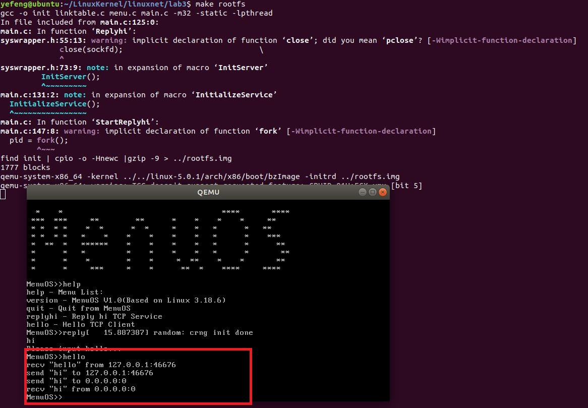 cd ~/LinuxKernel/ cd linuxnet/lab3 make rootfs