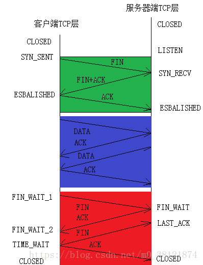 数据传输完毕后,双方都可释放连接。最开始的时候,客户端和服务器都是处于ESTABLISHED状态,然后客户端主动关闭,服务器被动关闭。