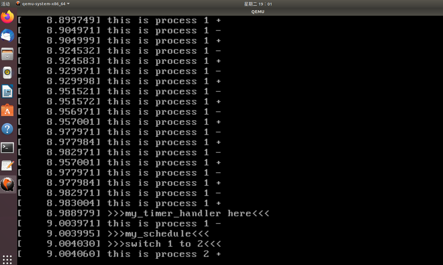 mymain.c中是一个死循环,不断输出"my_start_kernel here %d \n",myinterrupt.c中则不断输出时钟中断"my_timer_handler here"。而根据之前qemu的运行结果,可以看出进程和时钟中断不断的交替运行。而我们要做的事情就是写一个自己的进程控制块以及进程调度算法,从而实现模拟多个进程调度运行。