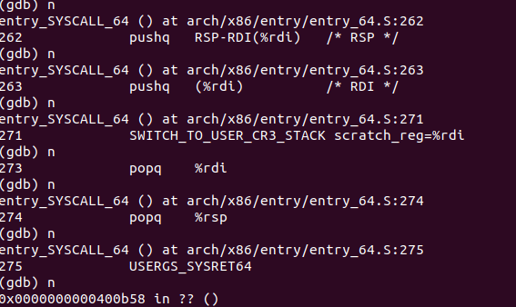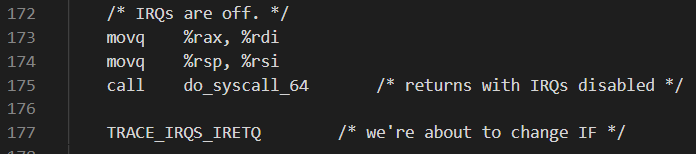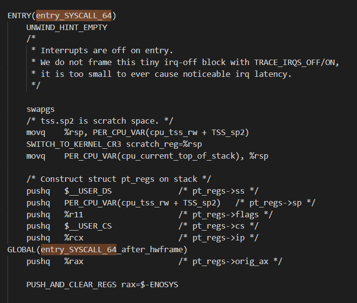 可以看到,它没有使用sava_all命令保存现场,而使用了特殊的swapgs,来快照式地保存现场,加快了系统调用的速度。
