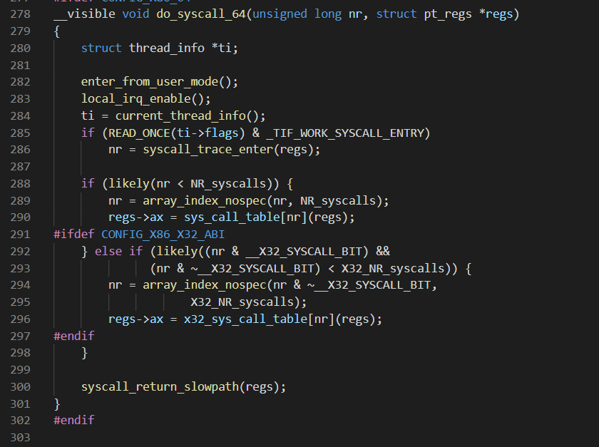 系统调用的保存现场和恢复现场;entry_SYSCALL_64是系统调用的入口点,它完成了保存现场,调用对应的内核处理函数、恢复现场、系统调用返回等工作。