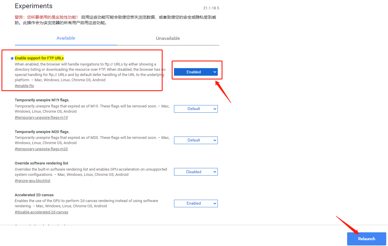 2)找到Enable support for FTP URLs,设置为Enable(启用),点击Relaunch(重新启动)