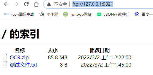 在谷歌浏览器直接输入“ftp://127.0.0.1:9021/”,访问不了