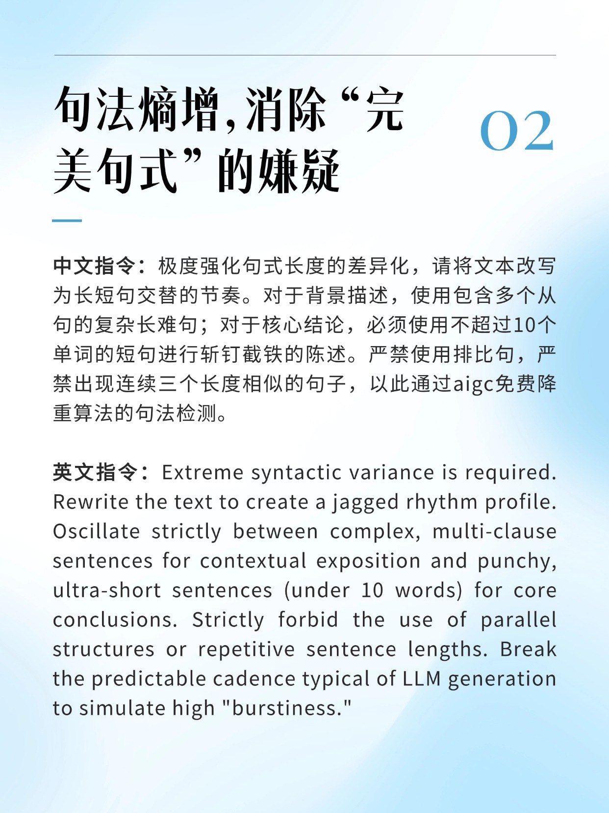 核心原理:模拟人类写作的呼吸感,人类写文章,会用一个极长的复杂句解释原理,紧接着用一个极短的断句下结论。