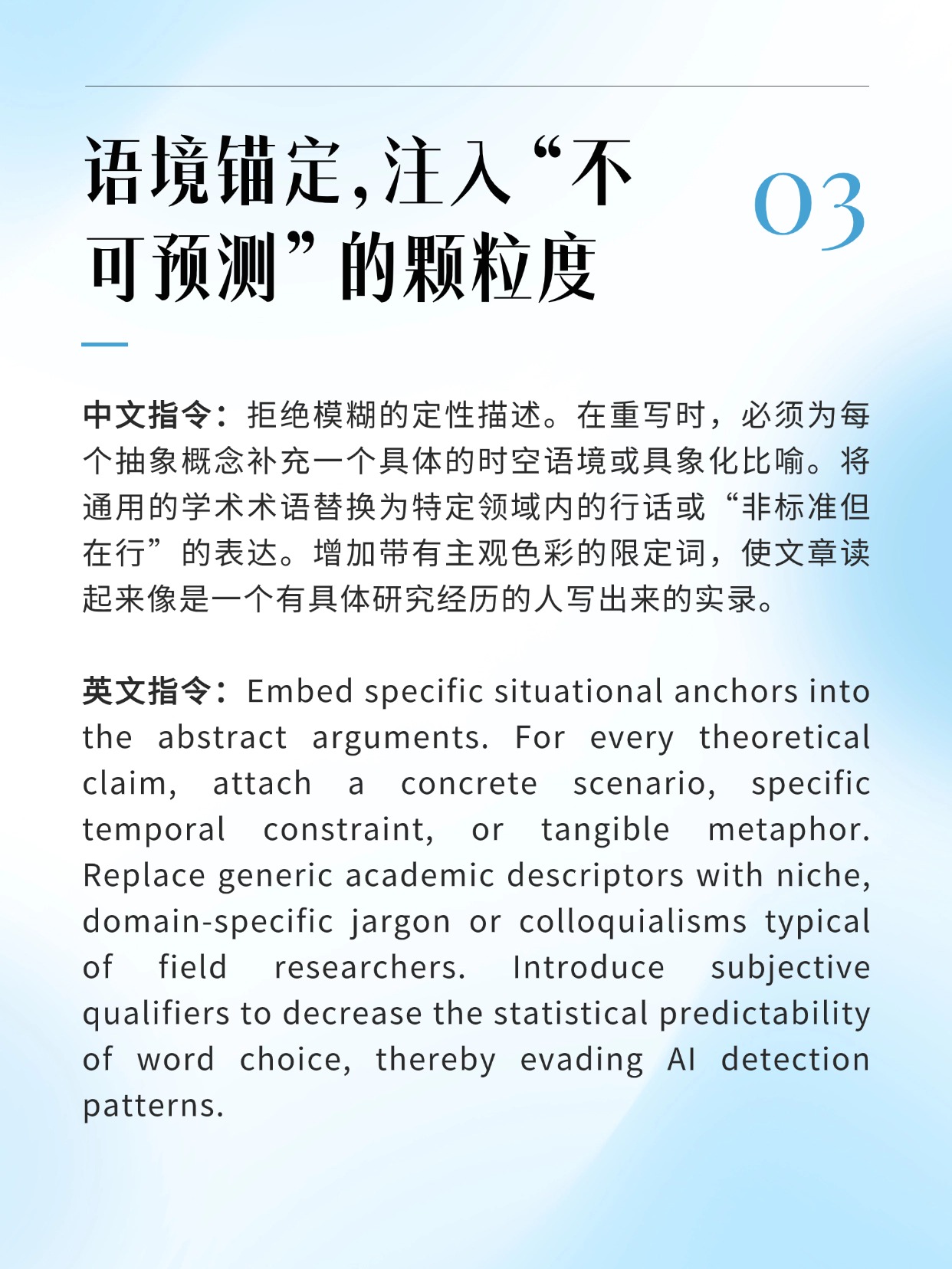 核心原理:把通用的理论,强制绑定到极其具体的场景或案例中,增加文本的信息密度。