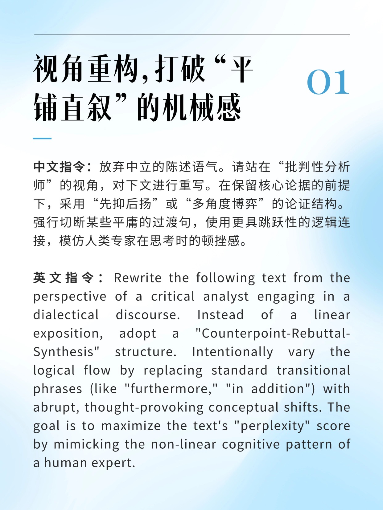 AI生成的最大特征是“正确但平庸的上帝视角”。要ai降ai,第一步不是改词,而是强行植入一个具有批判性的“人类观察者”视角,迫使模型重组叙事逻辑。