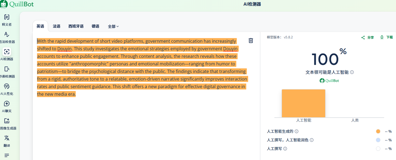 这个工具的路子比较野。面对一篇90% AI率的稿子,它确实能给你降到15%。效果是猛,但副作用是它会把句子结构拆得很碎。如果你有一段完全不想留、只想彻底重写的废话,用它来降ai是很爽的,但改完后记得检查连词。