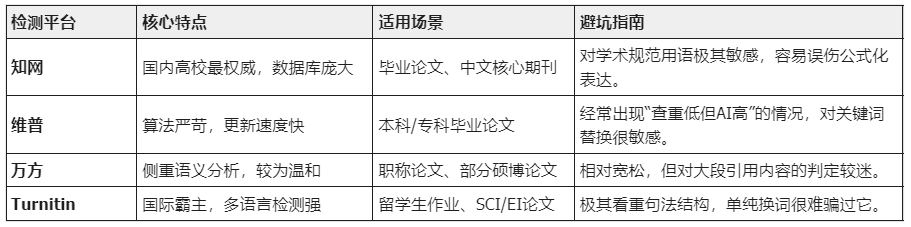 很多同学问我检测准不准,其实每个平台的算法逻辑都不一样,大家可以对照这张表避坑: