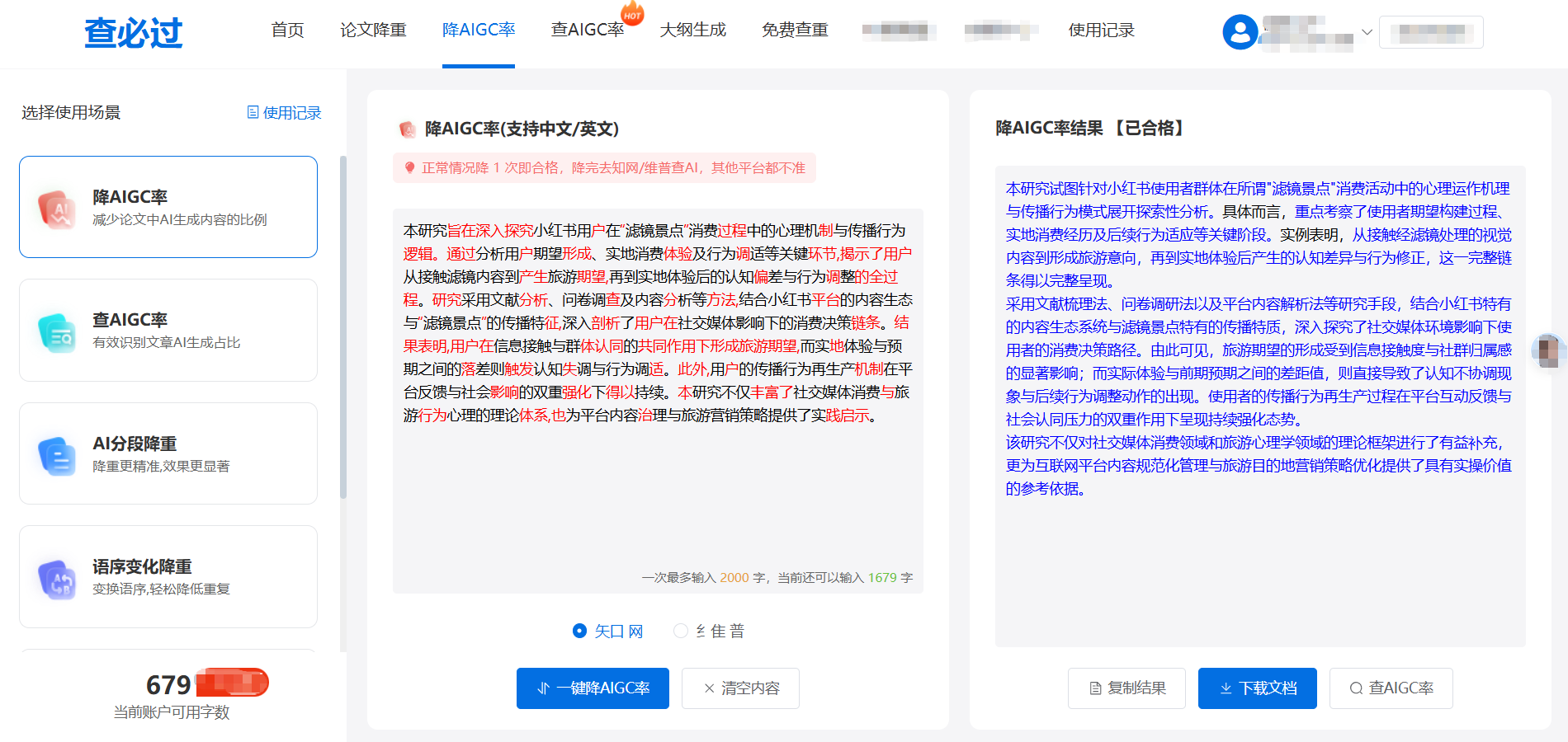 失败经验:唯一的痛点就是贵,我当时不知道它按“百字”计费,以为是“千字”,充值的时候心都在滴血。所以这个工具只建议在定稿前用,别拿初稿去试水,太奢侈了。