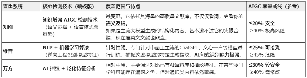 很多同学以为查重系统都一样,其实它们的算法逻辑天差地别。看看下面这张表,你就知道为什么你在维普过了,去知网却“死”得很惨。