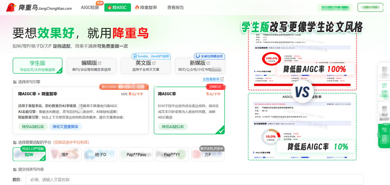 使用体验: 针对性很强,能选专门对标知网还是维普。我当时要把一篇维普查重红了的文章降下来,用它定向优化后效果立竿见影。