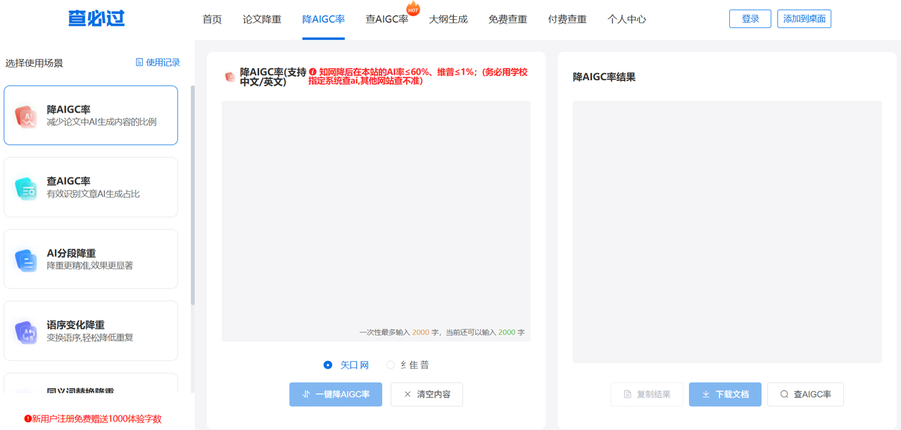 避坑指南:单次降AIGC率限制在2000字以内,长论文需要分多次提交。