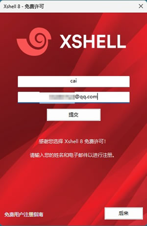 首次启动 Xshell,会弹出下图,输入邮箱,然后点击提交,这里注册是免费的哈: