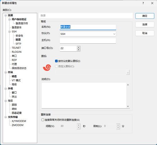 在“主机”栏输入 Linux 虚拟机的 IP 地址或主机名,“端口”栏默认为 22(除非你更改了SSH端口)。同时,我们还需要配置身份验证方式: