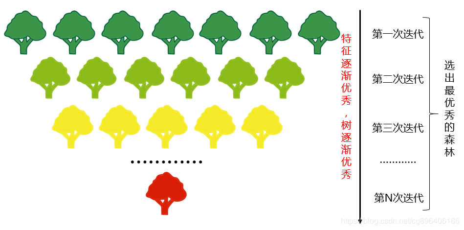 2.按照上面的步骤迭代多次,逐步去除相对较差的特征,每次都会生成新的森林,直到剩余的特征数为为止。最后再从所有迭代的森林中选出最好的森林。迭代的过程如下图所示: