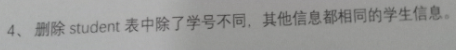 1查询所有学生的学号、姓名、选课数、总成绩,3、查询出每门课程都大于80分的学生姓名4、删除除了id号不同,其他信息都相同的学生冗余信息