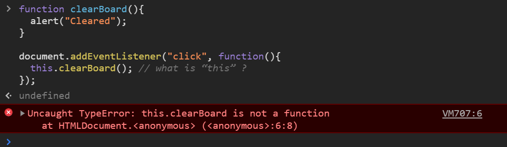 当我们执行以上代码片段并单击页面时,你会收到错误消息。这是因为函数clearBoard是在窗口中定义的,而匿名函数是在文档的上下文中执行的。