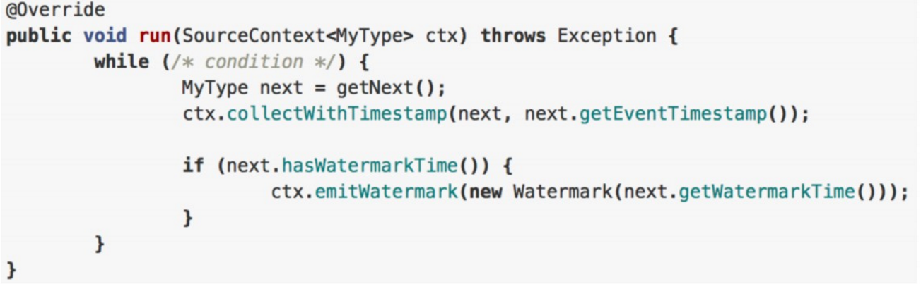 - 也可以调用 emitWatermark 方法去产生一条 watermark,表示接下来不会再有时间戳小于等于这个数值记录。