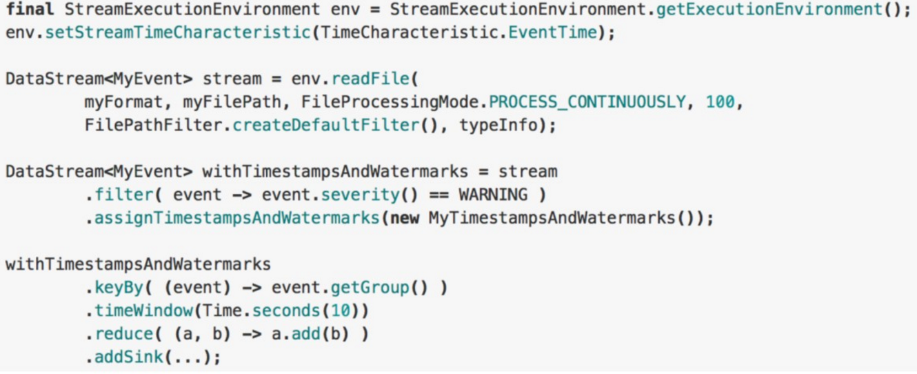 - 调用 DataStream.assignTimestampsAndWatermarks 这个方法,能够接收不同的 timestamp 和 watermark 的生成器。