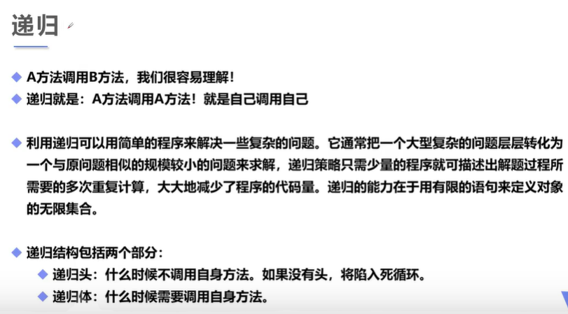 注:递归次数太多,调用太多次方法可能导致栈溢出,报错,尽量少使用