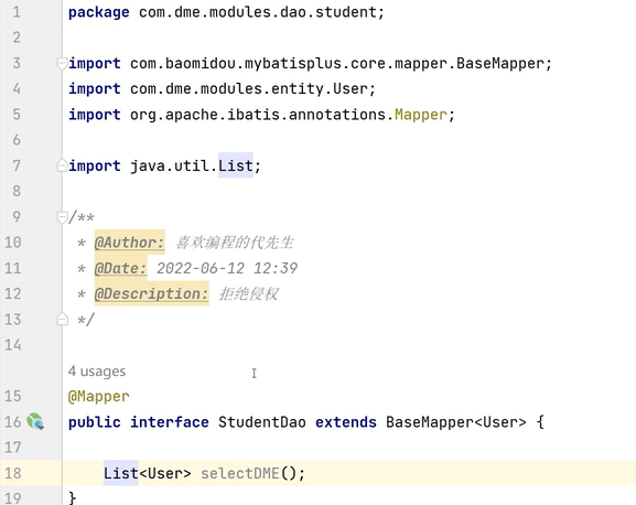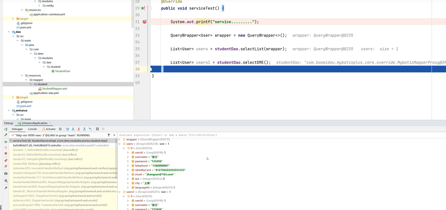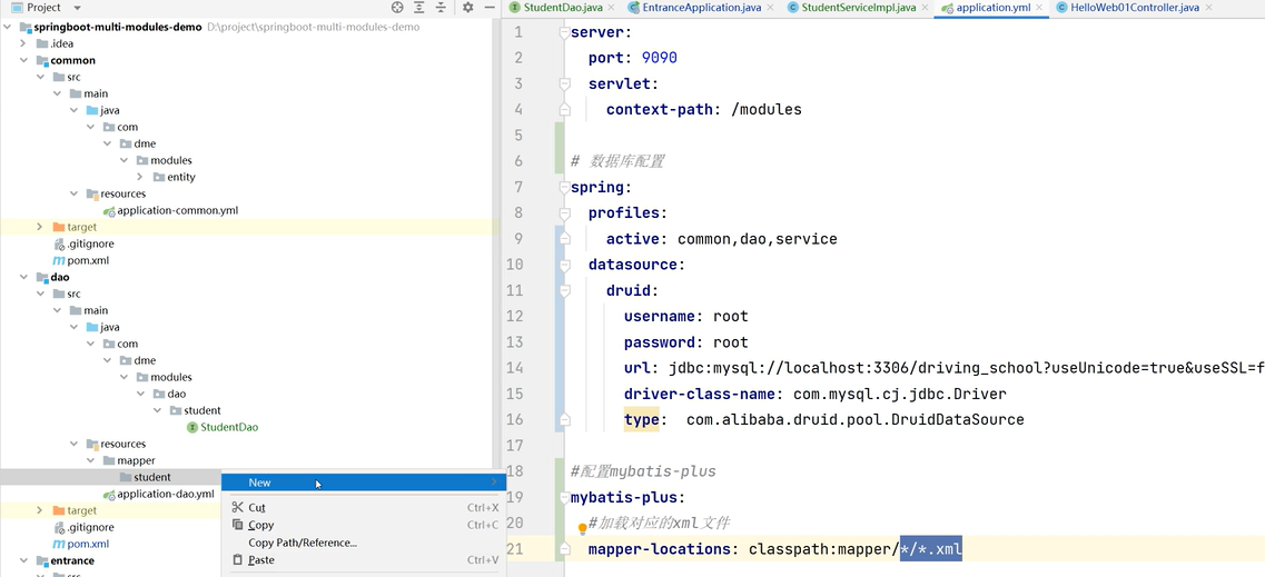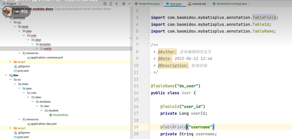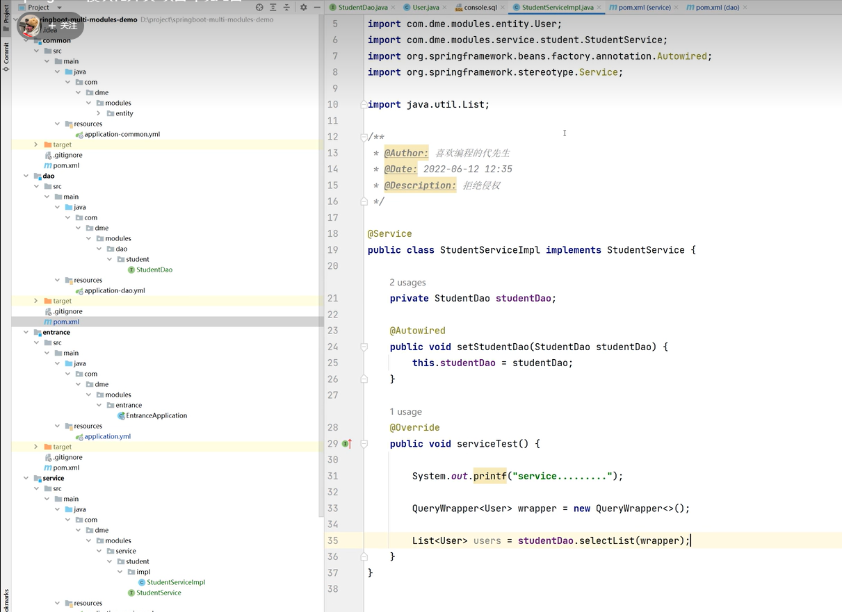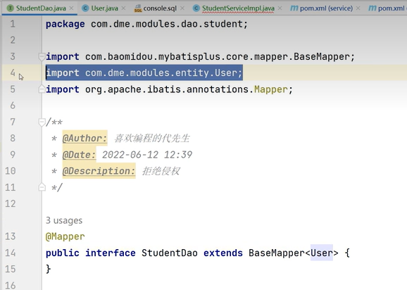 8.common里创建entity(字段、数据库映射、getset、构造),dao模块创建接口,service引用dao