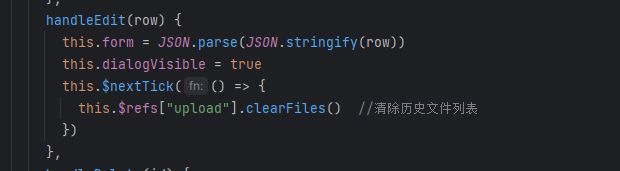 4.进一步优化Book.vue,现在上传之后浏览器会记录上传的文件,再打开新增,会把刚刚上传的文件再次带入,修改如下,进入dialog之前清除历史文件,但是第一次点击会报错,因为dialog还没显示过,找不到ref="update",所以使用$this.nextTick,就可以找到后加载出来的dialog