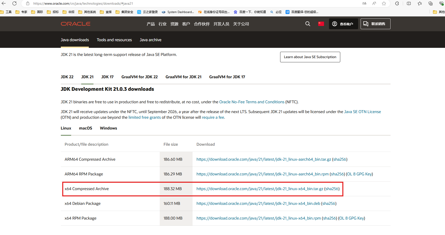 1.官网地址:https://www.oracle.com/cn/java/technologies/downloads/#java21,本次下载的是jdk21,x64 Compressed Archive版本