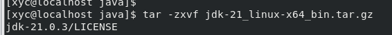 3. 使用命令tar -zxvf jdk-21_linux-x64_bin.tar.gz解压缩