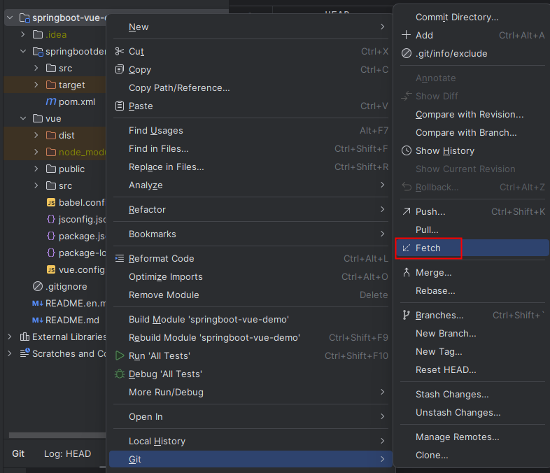 5.核查发现因为远端仓库有README.md,本地项目里也有README.md,所以需要先Fetch,把远端仓库拉取过来