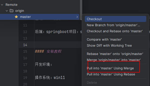 6. 拉取后增加了一个远端分支,与本地项目合并