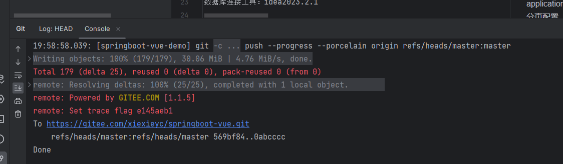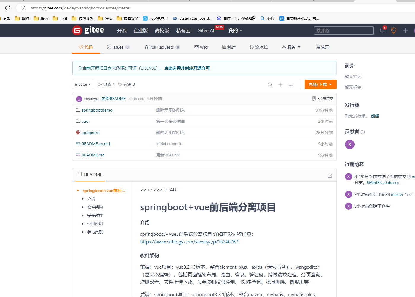 3. 创建后自动识别出待提交的文件,输入说明,提交,提交后让输入git名称和邮箱,设置并提交,提交成功。我这个项目是前后端都放一起了,提交后自动帮我拆分了。