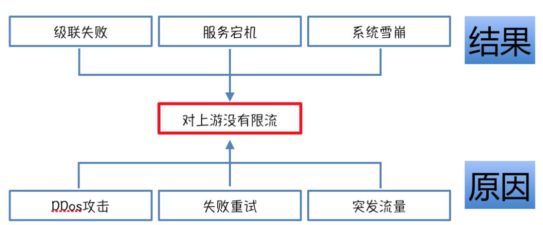 在开放式的网络环境下,对外系统往往会收到很多有意无意的恶意攻击,如DDoS攻击、用户失败重刷。虽然我们的队友各个是精英,但还是要做好保障,不被上游的疏忽影响,毕竟,谁也无法保证其他同学哪天会写一个如果下游返回不符合预期就无限次重试的代码。这些内部和外部的巨量调用,如果不加以保护,往往会扩散到后台服务,最终可能引起后台基础服务宕机。下图是对无限流影响的问题树分析: