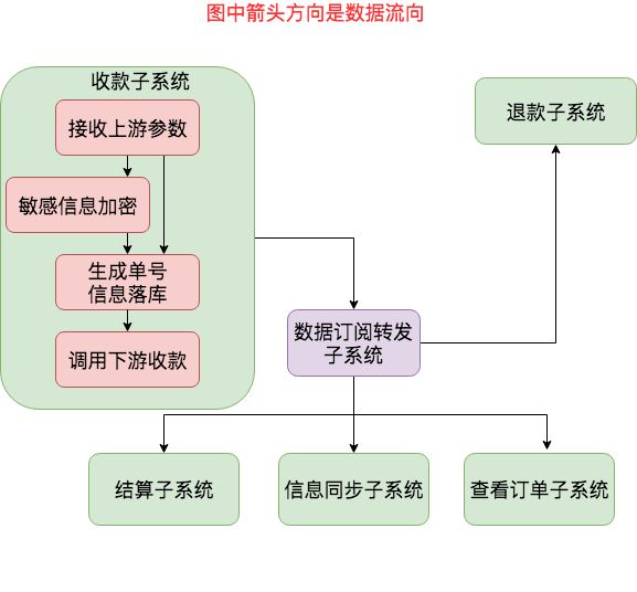 基于上面分析,我们需要做一个收款子系统和其他子系统之间的一个解耦,统一管理给其他系统的数据。这里称为“订阅转发子系统”,只要保证这个系统不影响收款子系统的稳定即可。