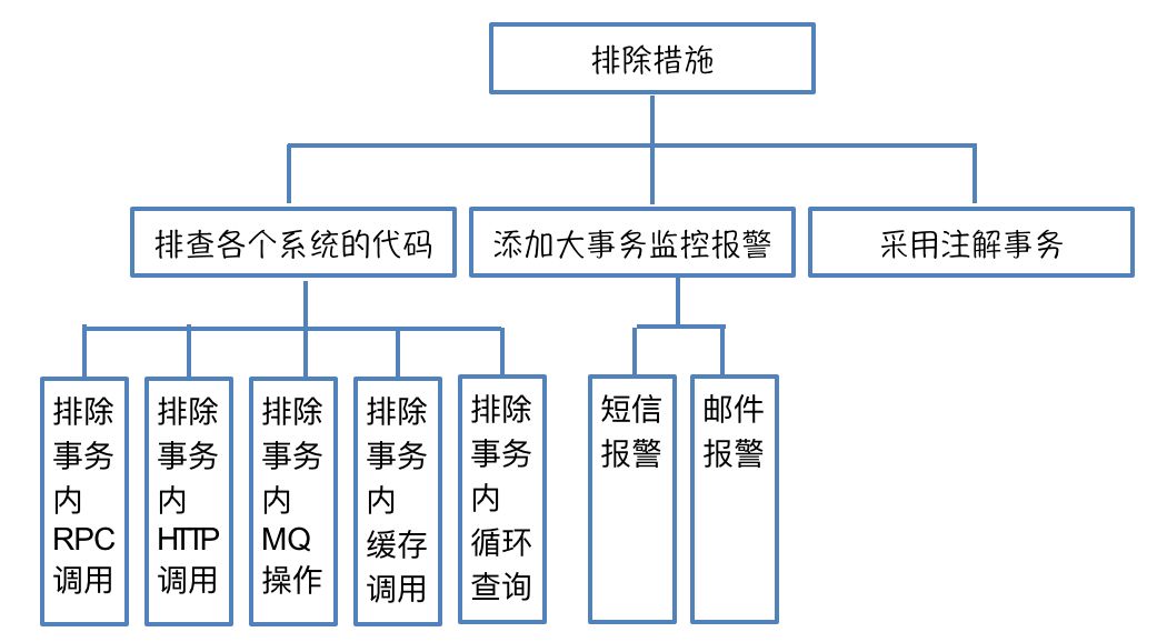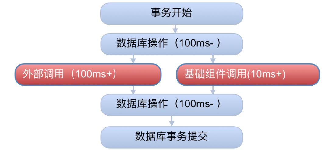 排查各个系统的代码,检查在事务中是否存在RPC调用、HTTP调用、消息队列操作、缓存、循环查询等耗时的操作,这个操作应该移到事务之外,理想的情况是事务内只处理数据库操作。