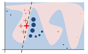 在直觉上看,下图示例是一个比较复杂的二分类,整体并不是线性可分的,通过训练得出了复杂的二分类模型f,不同分类分别使用蓝色和肉色表示;对局部实例x(粗红十字),通过在它附近模拟一些实例z(十字和圆点),并且根据它们与x的距离赋予不同权重,用z和x训练简单的线性模型g,用于在局部范围内拟合x。再从简单模型g中提取可描述的特征。