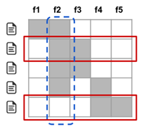 图中的行代表各个文档(实例),列代表文档中出现的关键词(特征),图中通过各个特征在各个实例的重要性构造了矩阵W。可以看到第二列特征对于每个文档都很重要(蓝色);第二行和第五行涵盖了除f1特征之外的所有特征。