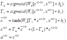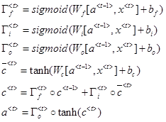公式中的Γ表示门控gate,门控使用sigmoid函数计算得出0-1之间的值,用于过滤(保留或去掉)数据。LSTM中增加的门控分别是:遗忘门f,输入门i和输出门o,它们分别控制在更新当前cell内容时,之前的cell占比,当前的cell占比,以及如何用cell生成a。