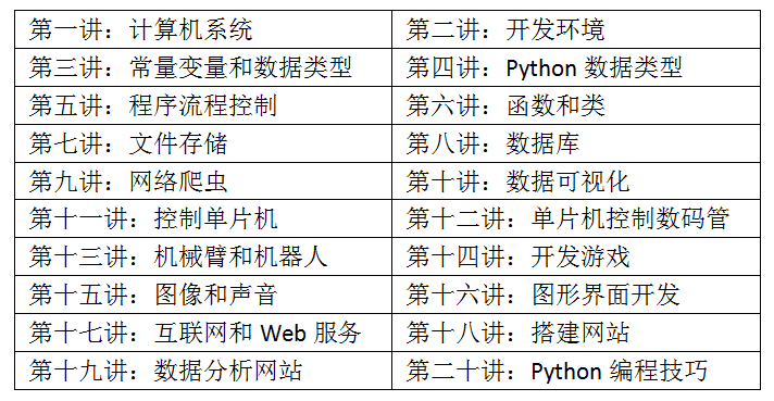 暑假里给孩子讲了20节计算机课,并在每一讲中加入了思维训练的内容。比如:思维导图、统筹规划、知识拓展与知识屏蔽、分层抽象等等。目录如下: