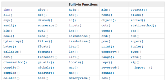 abs(-1) -- > 结果为1 divmod(10,3) -- >结果是(3,1) 把10除以3 得到的记过给一个元组,元组的第一个元素为商,第二个元素为余数 all([1,2,3,'']) -- > False,列表中所有的为True,返回值才为True any([1,2,3,'']) -- > True,列表中只要有一个值为True,返回值就为True bin(3) --- > 将3转换为二进制,结果为0b11 bool() --> 布尔值转换 bytes(‘你好’,encoding('utf-8')) -- > 把字符串按照指定的格式转换为字节码 dict() -- > 转换为字典 dif(object) --> 查看对象里的方法 enumerate(iter) --->用于将一个可遍历的数据对象(如列表、元组或字符串)组合为一个索引序列,同时列出数据和数据下标,一般用在 for 循环当中。 eval(str) 1、把字符串中的数据结构给提取出来 2、将字符串中的表达式进行运算 filter() -- > 过滤某元素 float() --> 转换为浮点类型 format() --> 字符串格式化 frozenset() --> 不可变集合 globals --> 全局变量 #可hash的数据类型即不可变数据类型,不可hash的数据类型即可变数据类型 hash(str) -->传入 值计算出hash值返回 help(object) --> 查看对象的帮助文档 hex(x) --> 将十进制转换为16进制 oct(x) --> 将十进制转换为8进制 id(object) -- > 打印对象的内存地址 input() -- > 等待用户输入 int() --> 转换为整型 isinstance(1,int) --> 判断1是不是int的实例,判断对象是那个类的实例 len() --> 对象的长度 list() --> 转换为列表 globals() --> 打印当前级别的所有全局变量 locals() --> 打印当前级别的所有局部变量 max(iter) ---> 取最大值,注意不同类型间不能比较,默认从第一个元素比较,第一个元素如果取出最大的,就不会比较后面的元素,如果第一个元素没有分出大小,继续往后比较,还是和之前一样,如果比较出大小就不再往后比较 l = [ (5,'e'), (1,'a'), (3,'c') ] print(max(l)) 输出结果为 (5,'e') 也可以和zip结合使用比较字典value值,同时把key也打印出来 k = { 'sda': 12, '23': 123 } print(list(max(zip(k.values(),k.keys())))) 输出结果为 [123,'23'] 更加高级的用法: people = [ {'name' : 'alex','age' : 10000}, {'name' : 'qaz','age' : 9000}, {'name' : 'qwe','age' : 10001}, {'name' : 'asb','age' : 18}, ] print(max(people,key=lambda dic:dic['age'])) 结果: {'name': 'qwe', 'age': 10001} min(iter) ---> 取最小值 zip(x,y) --->函数用于将可迭代的对象作为参数,将对象中对应的元素打包成一个个元组,然后返回由这些元组组成的列表。如果各个迭代器的元素个数不一致,则返回列表长度与最短的对象相同,利用 * 号操作符,可以将元组解压为列表。 chr() ---> 将asiic码转换为对应的字符 ord() ---> 将字符转换为对应的asiic码 pow(3,3) ---> 相当于3**3 ,如果有第三个参数如pow(3,3,2)相当于3**3%2 print() ---> 输出 range(100) --->可创建一个0-99整数列表,一般用在 for 循环中。 reversed() ---> 反转 set() ---> 转换为集合 slice() ---> 切片 sorted() ---> 排序,跟max,min的原理一样 例1 people = [ {'name' : 'alex','age' : 10000}, {'name' : 'qaz','age' : 9000}, {'name' : 'qwe','age' : 10001}, {'name' : 'asb','age' : 18}, ] print(sorted(people,key=lambda dic:dic['age'])) 结果: [{'name': 'asb', 'age': 18}, {'name': 'qaz', 'age': 9000}, {'name': 'alex', 'age': 10000}, {'name': 'qwe', 'age': 10001}] 例2 name_d = { 'qaz':900, 'qwda':300, 'qwrewt':200 } print(sorted(name_d.items(),key=lambda tup:tup[1])) print(sorted(zip(name_d.values(),name_d.keys()))) 结果: [('qwrewt', 200), ('qwda', 300), ('qaz', 900)] [(200, 'qwrewt'), (300, 'qwda'), (900, 'qaz')] str() ---> 转换成字符串 sum() ---> 求和 tuple() ---> 转换为元组 type() --- > 查看数据类型 __import__() ---> 当导入文件为字符串时,用import不能直接导入,如要用__import__(字符串文件名)才能导入 import 调用sys操作系统,然后操作系统再调用__import__