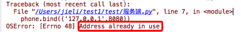 #加入一条socket配置,重用ip和端口 phone=socket(AF_INET,SOCK_STREAM) phone.setsockopt(SOL_SOCKET,SO_REUSEADDR,1) #就是它,在bind前加 phone.bind(('127.0.0.1',8080))