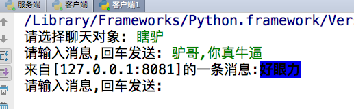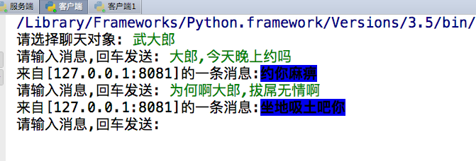 #_*_coding:utf-8_*_ __author__ = 'Linhaifeng' import socket BUFSIZE=1024 udp_client_socket=socket.socket(socket.AF_INET,socket.SOCK_DGRAM) qq_name_dic={ '狗哥alex':('127.0.0.1',8081), '瞎驴':('127.0.0.1',8081), '一棵树':('127.0.0.1',8081), '武大郎':('127.0.0.1',8081), } while True: qq_name=input('请选择聊天对象: ').strip() while True: msg=input('请输入消息,回车发送: ').strip() if msg == 'quit':break if not msg or not qq_name or qq_name not in qq_name_dic:continue udp_client_socket.sendto(msg.encode('utf-8'),qq_name_dic[qq_name]) back_msg,addr=udp_client_socket.recvfrom(BUFSIZE) print('来自[%s:%s]的一条消息:\033[1;44m%s\033[0m' %(addr[0],addr[1],back_msg.decode('utf-8'))) udp_client_socket.close()